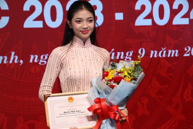 Á hậu Hoa hậu Thế giới Việt Nam 2023 Huỳnh Minh Kiên được trường đại học khen thưởng trong lễ khai giảng.